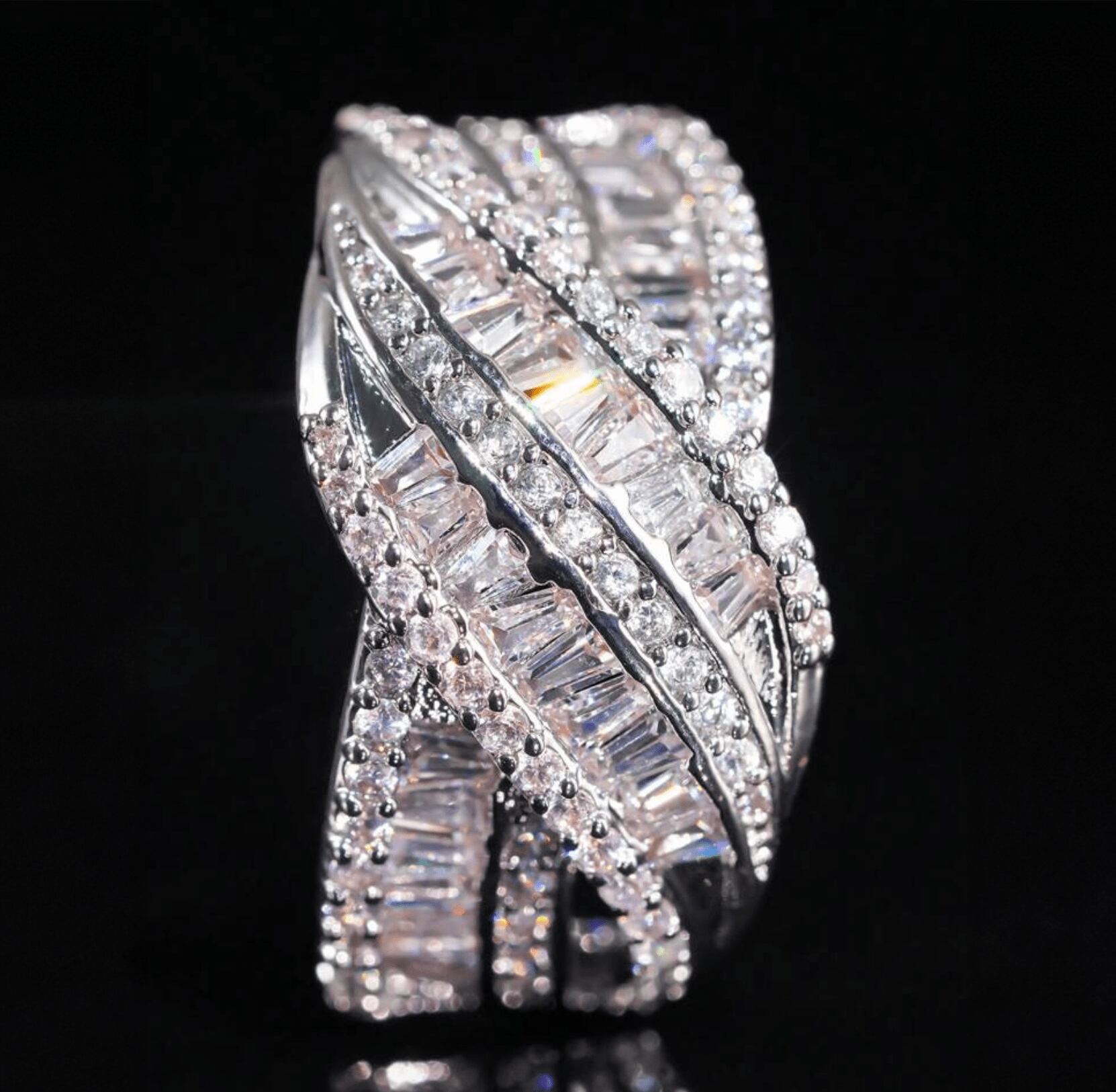 繊細なラインが指先で美しく交差する立体美が目を惹く前衛的なシルバーリング。流れるような曲線に沿って敷き詰められたスワロフスキーが、光を巧みに操り、手元に都会的な洗練とドラマチックな躍動感を授けます。程よい抜け感のあるデザインは、オフィスでは知的なセンスを感じさせるアクセントに。普段の装いには、凛としたモードな彩りを添えてくれます。また、その独創的な煌めきはパーティーシーンでも上品な個性を放ちます。