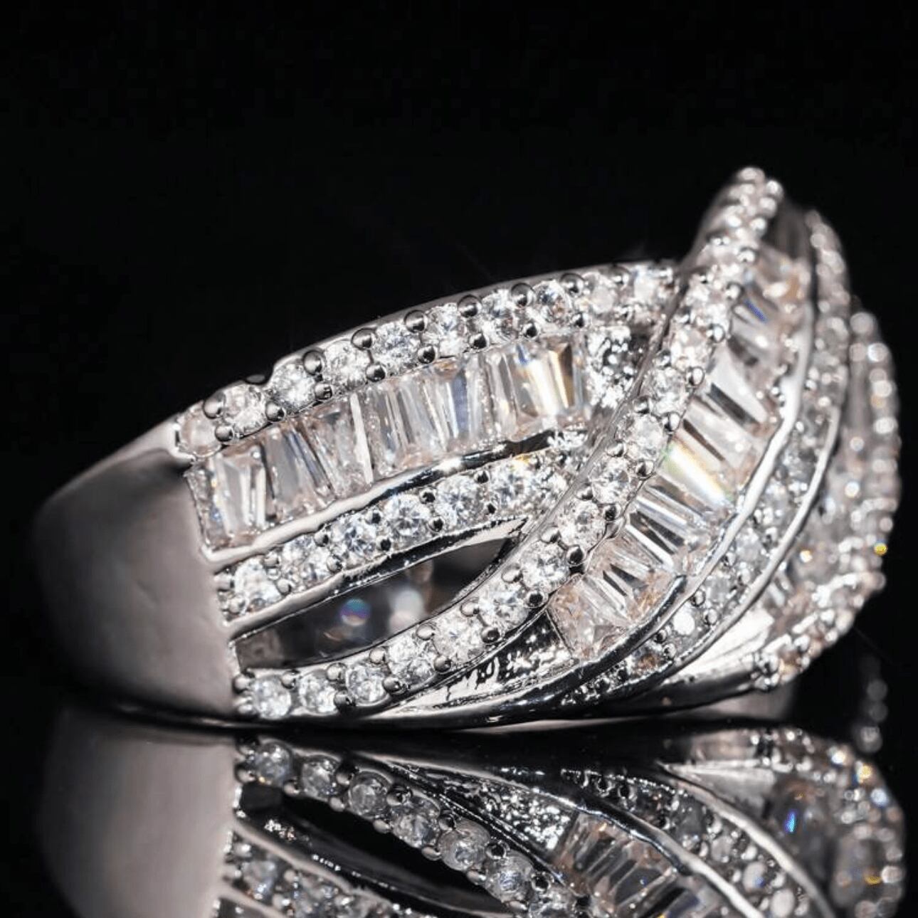 繊細なラインが指先で美しく交差する立体美が目を惹く前衛的なシルバーリング。流れるような曲線に沿って敷き詰められたスワロフスキーが、光を巧みに操り、手元に都会的な洗練とドラマチックな躍動感を授けます。程よい抜け感のあるデザインは、オフィスでは知的なセンスを感じさせるアクセントに。普段の装いには、凛としたモードな彩りを添えてくれます。また、その独創的な煌めきはパーティーシーンでも上品な個性を放ちます。