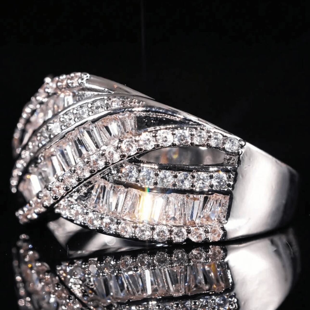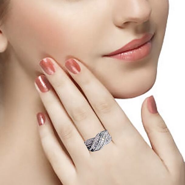 繊細なラインが指先で美しく交差する立体美が目を惹く前衛的なシルバーリング。流れるような曲線に沿って敷き詰められたスワロフスキーが、光を巧みに操り、手元に都会的な洗練とドラマチックな躍動感を授けます。程よい抜け感のあるデザインは、オフィスでは知的なセンスを感じさせるアクセントに。普段の装いには、凛としたモードな彩りを添えてくれます。また、その独創的な煌めきはパーティーシーンでも上品な個性を放ちます。