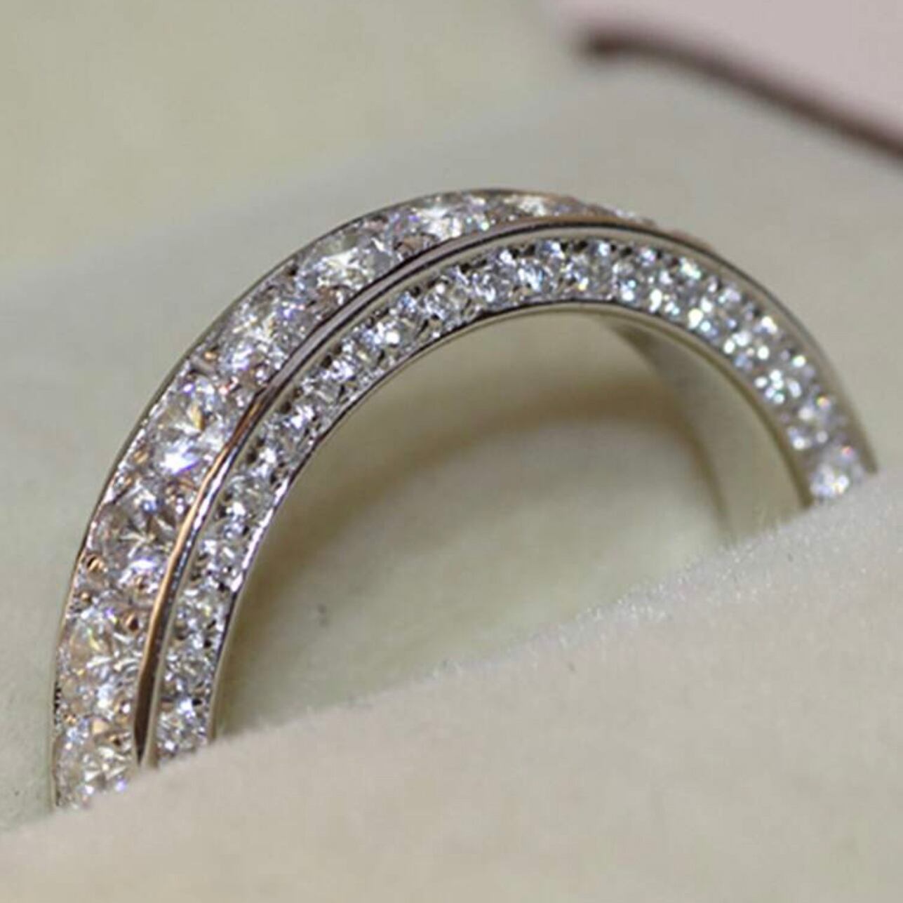 緻密に並べたスワロフスキーが途切れなく輝く、洗練のエタニティリング。シルバートーンの上品な光沢が指先を美しく引き立てます。オフィスでは知的で清楚な印象に、普段使いではさりげない高級感を演出。パーティーや記念日の装いには重ね着けで華やかな主役に。ジェンダーレスな美しさを備えた男女共用モデルです。