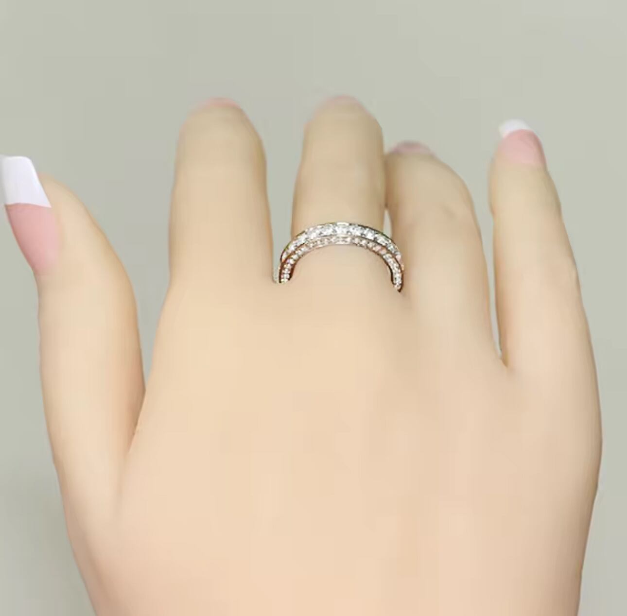 緻密に並べたスワロフスキーが途切れなく輝く、洗練のエタニティリング。シルバートーンの上品な光沢が指先を美しく引き立てます。オフィスでは知的で清楚な印象に、普段使いではさりげない高級感を演出。パーティーや記念日の装いには重ね着けで華やかな主役に。ジェンダーレスな美しさを備えた男女共用モデルです。
