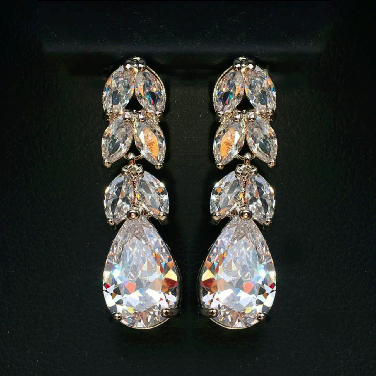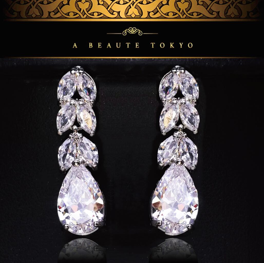 繊細なリーフラインと雫型のアヴューテダイヤモンドが連なり、重厚感と透明感を併せ持つロングピアスです。
