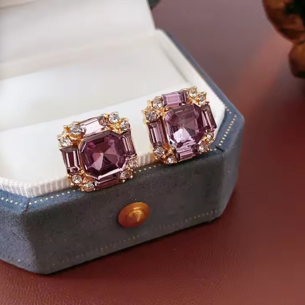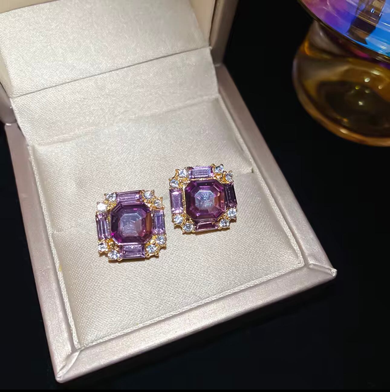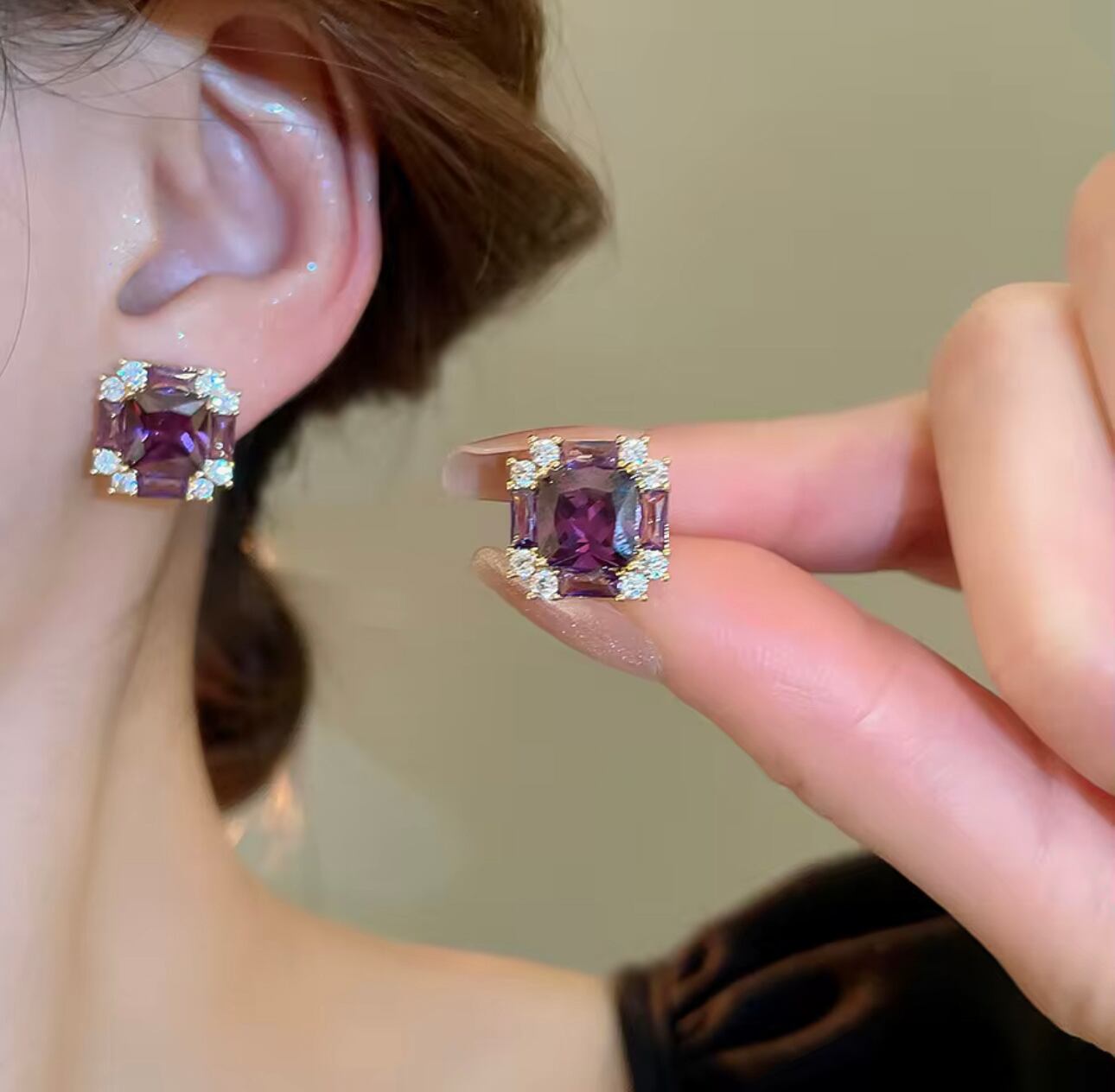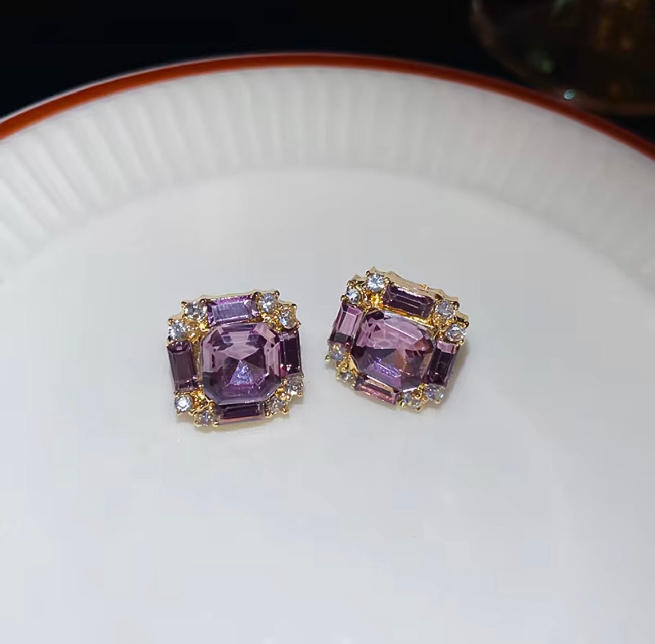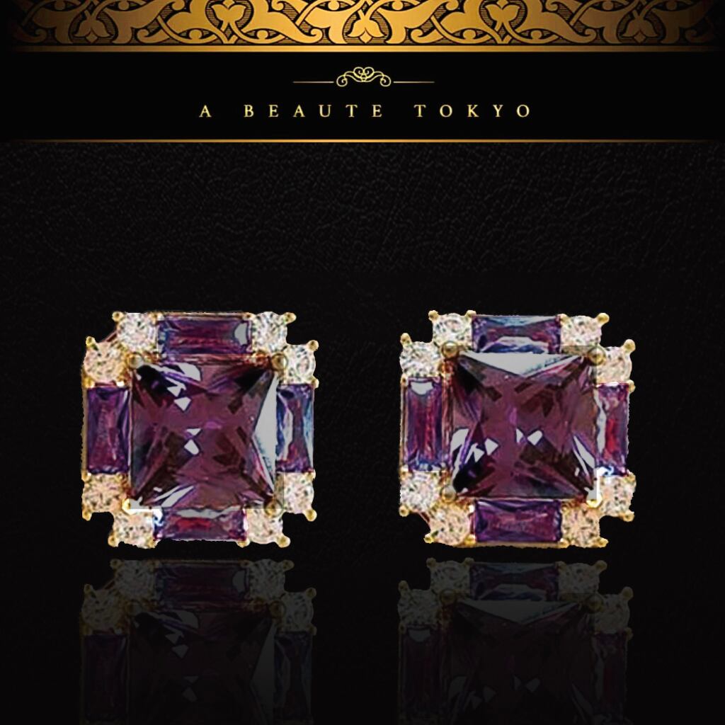 深みあるパープルの輝きを放つスワロフスキーを主役に、気品と華やかさを兼ね備えたスクエアピアスです。