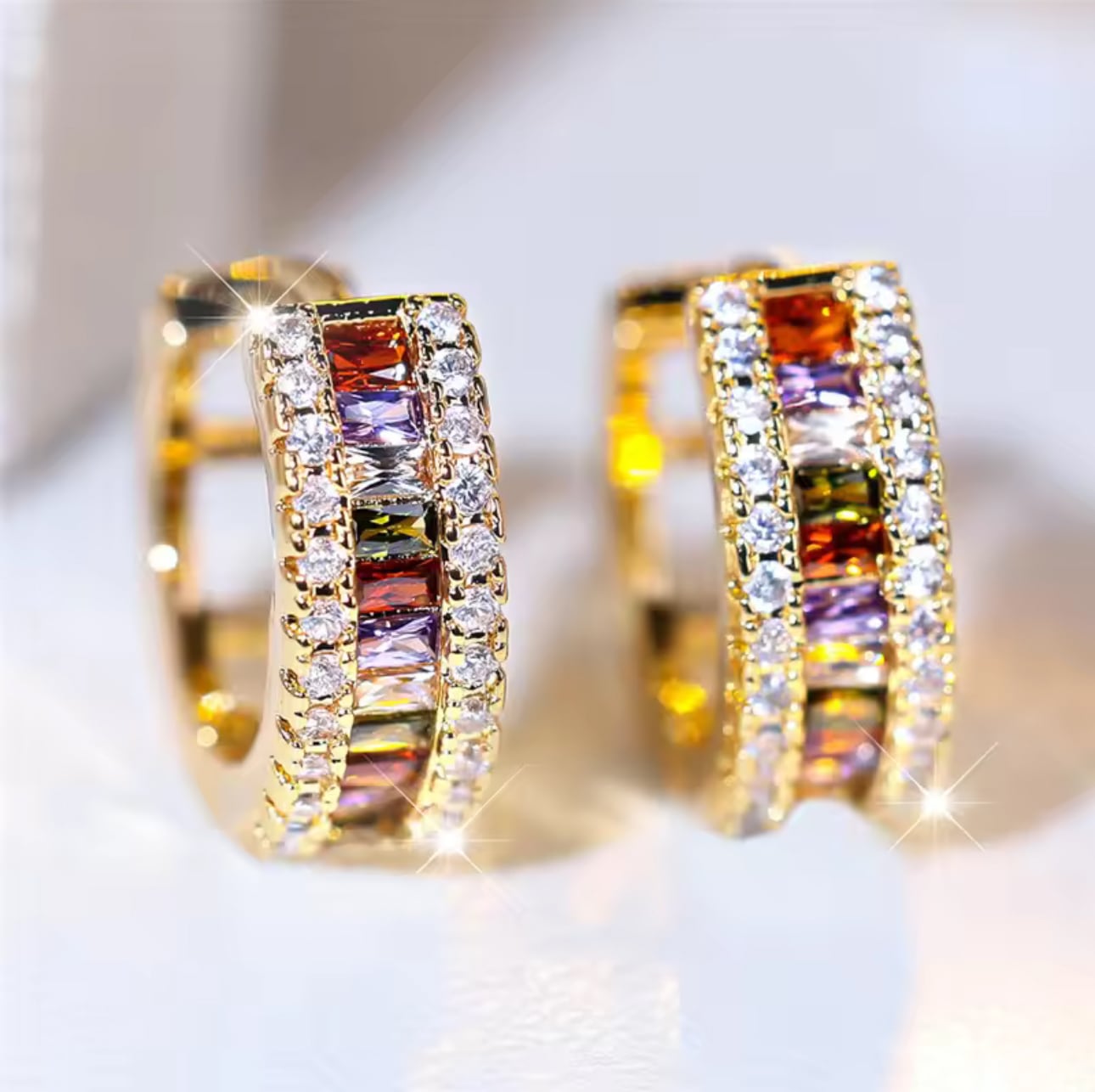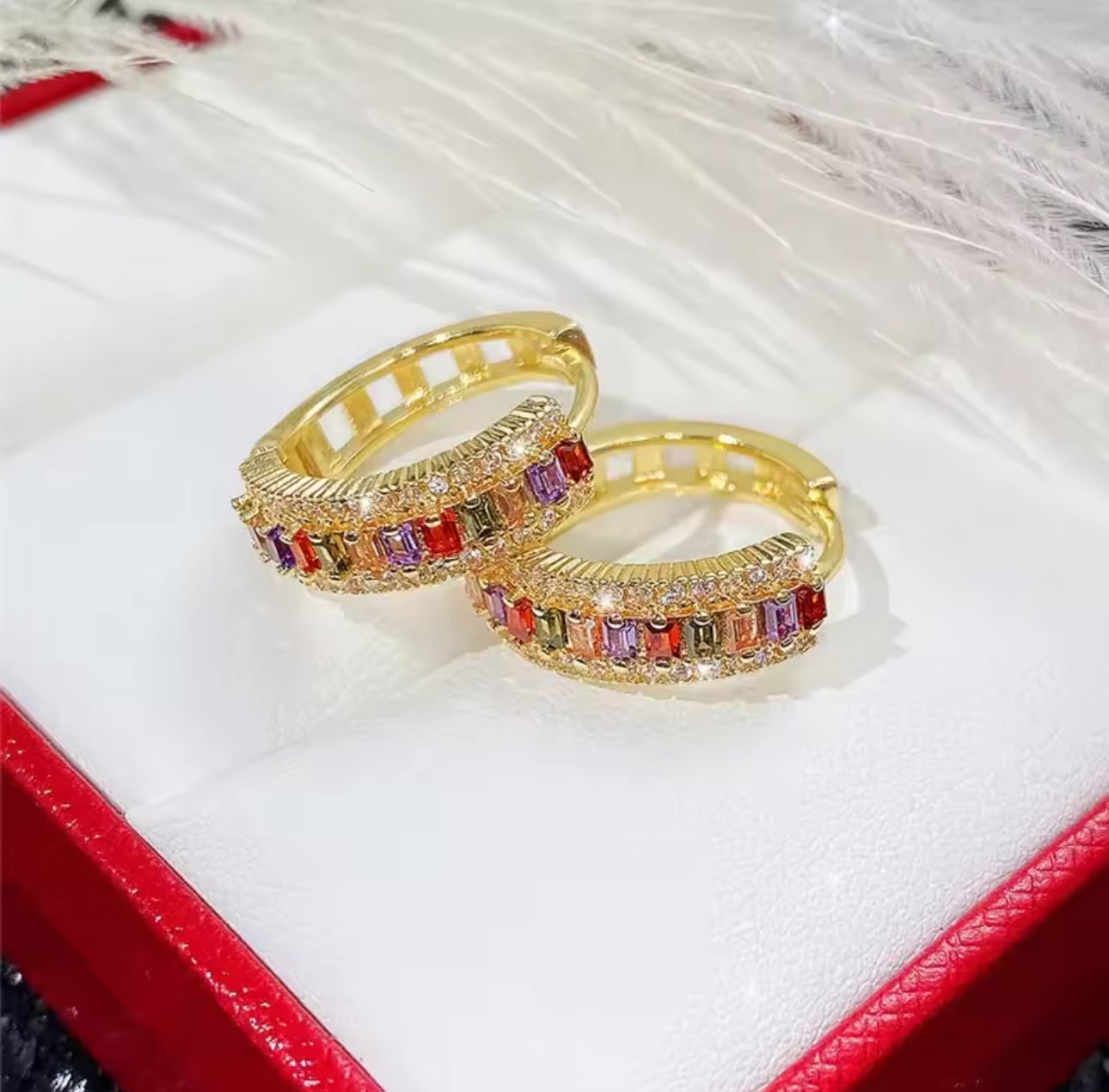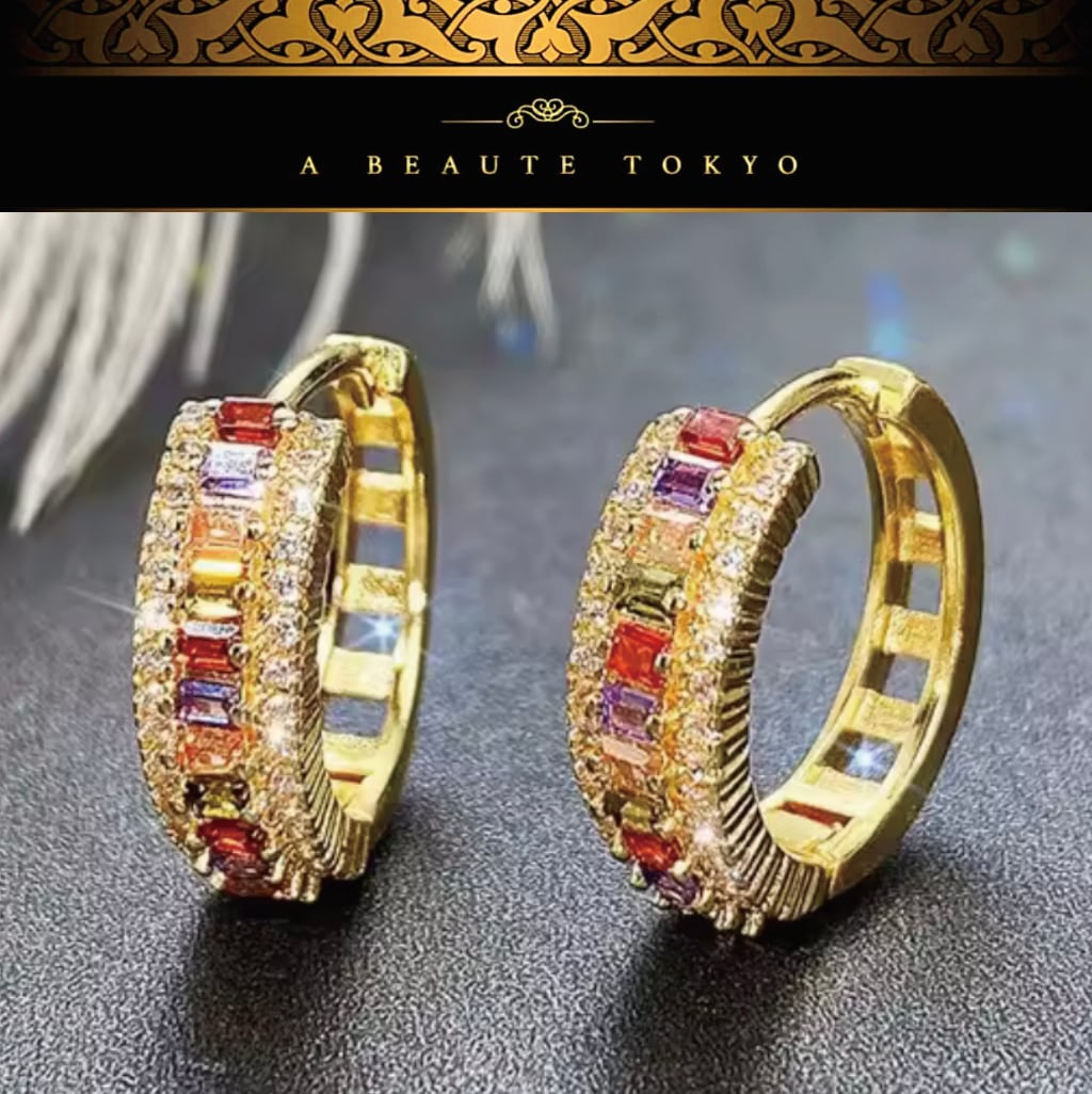 多彩なカラースワロフスキーが連なるフープピアスは耳元で華やかな光を奏でる一品です。オフィスでは洗練された印象を与え、上品さと遊び心を兼ね備えたデザインの華やかアクセサリーです。