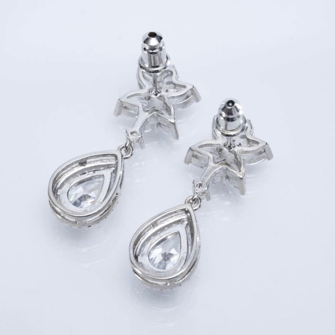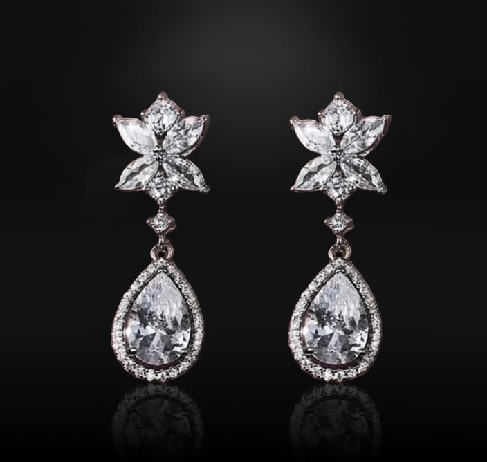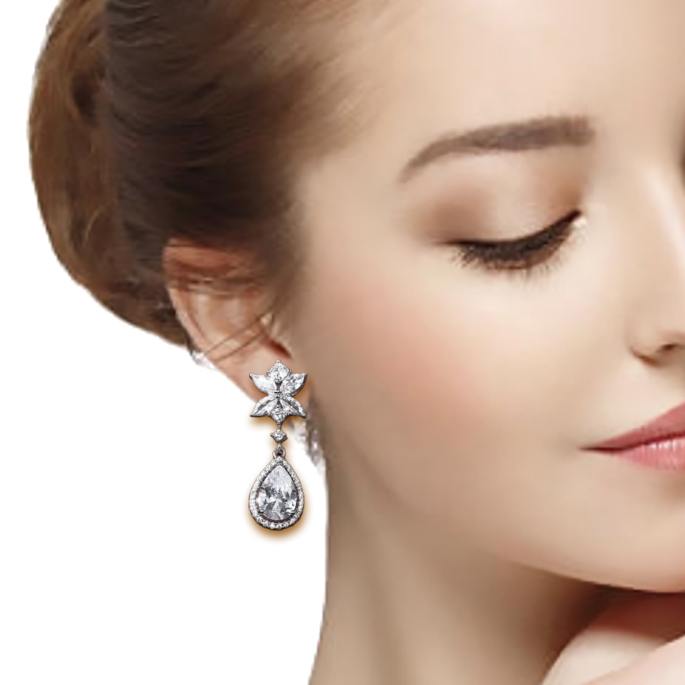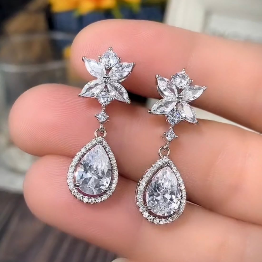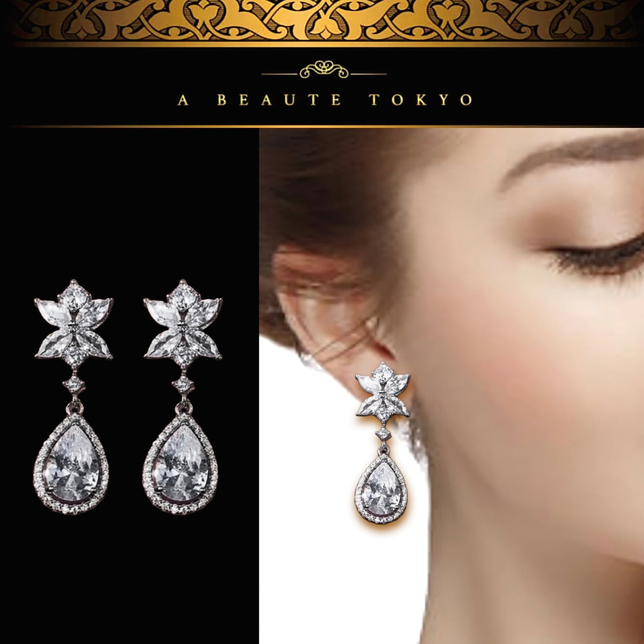花モチーフに繊細にセッティングされたアヴューテダイヤモンドが、気品ある輝きを放つロングピアス。下に揺れるティアドロップカットが光を集め、横顔を美しく印象づけます。
