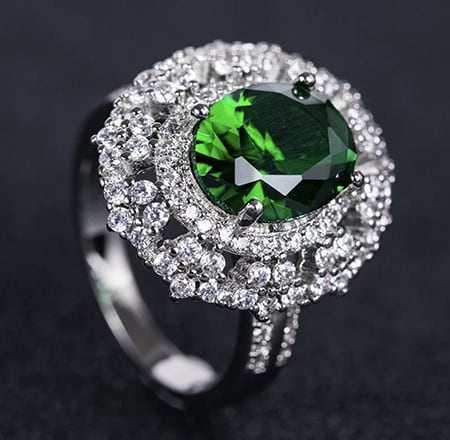 アヴューテの人工 エメラルド(SONAダイヤモンド)を使用した、お洒落なデザインリングです。人工宝石には傷やインクルージョン・汚れなどがないため、天然宝石よりも美しく輝きます。